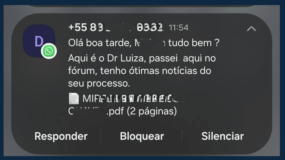 A experiência de um de nossos clientes: Nosso cliente nos relatou uma experiência amarga com este golpe. Ele recebeu uma mensagem de WhatsApp de alguém que se passava por mim, sua advogada, com a foto do perfil e até o número do processo! "A mensagem tinha o número do processo que movo na justiça, por isso eu acreditei", desabafou ele. O golpista afirmava que a causa havia sido ganha e que o pagamento de "custas judiciais" era necessário para liberar o suposto crédito. Ele ainda informou que "o pagamento deveria ser feito com urgência para que o valor fosse liberado logo". Felizmente, ele entrou em contato com o escritório pelo número que já conhecia e foi orientado a não prosseguir, evitando o prejuízo.