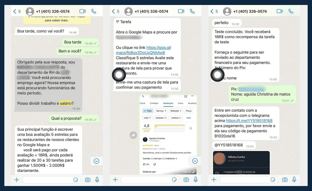 Os golpistas se apresentam como recrutadores ou representantes de empresas de marketing digital, com "vagas" para realizar tarefas simples, como curtir posts, assistir vídeos ou fazer avaliações online.